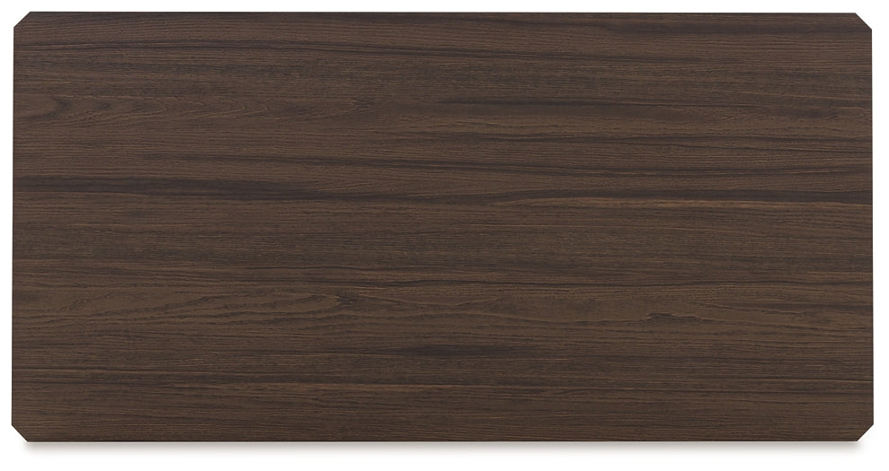 Details | Includes coffee table and 2 end tables, Made with MDF substrates, decorative laminate and steel, Tabletop with dark brown replicated walnut wood grain finish, Tubular steel legs with plated goldtone finish, Adjustable levelers included, Assembly required | |