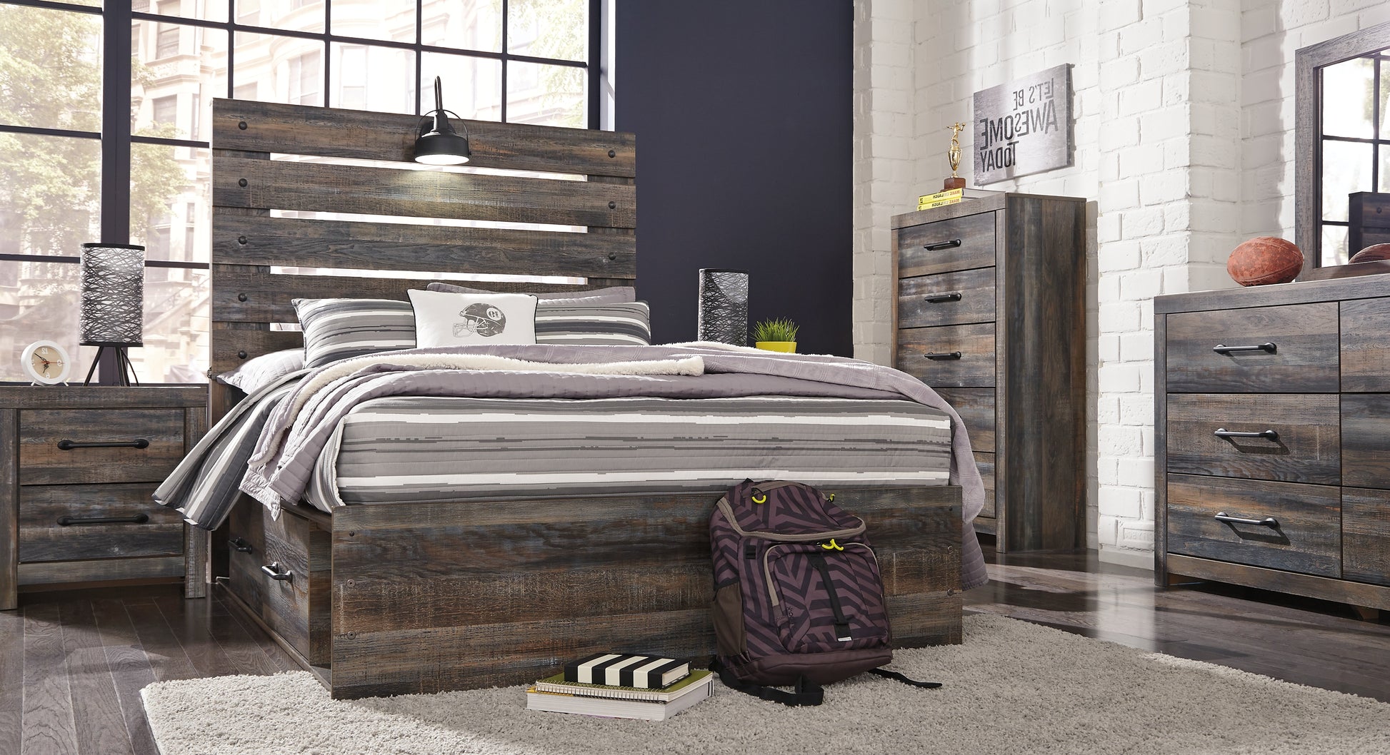 Details | Includes headboard, footboard, platform rails, side storage unit and wood roll slats, Made of engineered wood (MDF/particleboard) and decorative laminate, Brown rustic finish with burnt orange and teal accents in a replicated wood grain with authentic touch, 4 drawers and 4 open cubbies that each accommodate 10.5"W x 10.5"D x 11"H cube storage bin (not provided), 2 decorative sconce LED lights, each runs on 3AA batteries, 2 USB charging ports, Power cord included; UL Listed, Bed does not require additional foundation/box spring; accommodates most zero clearance adjustable bases with the addition of a bunkie board, Dark-tone industrial hardware, Assembly required, Small Space Solution, Mattress available, sold separately | |
