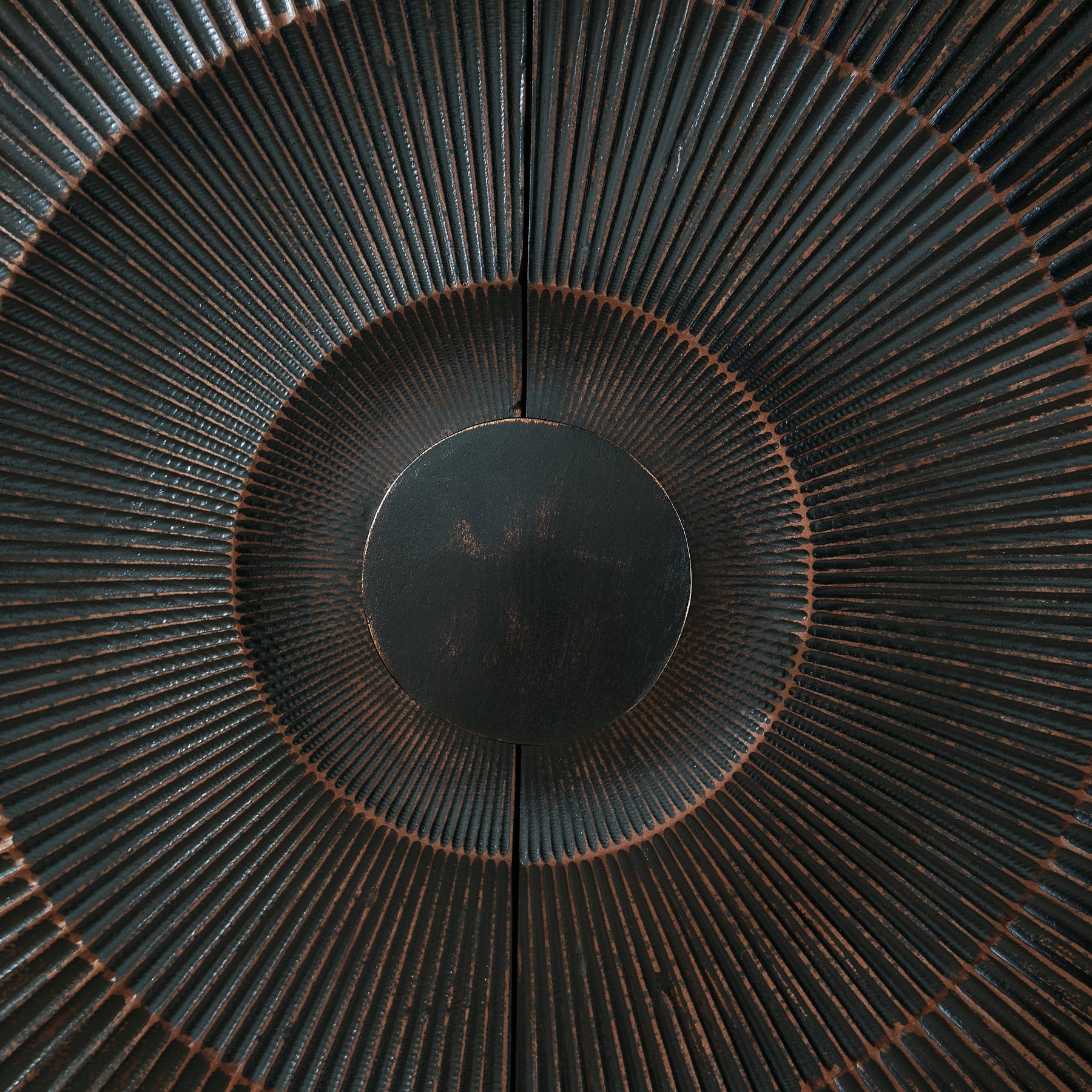 Details | Made with solid wood and engineered wood, Distressed black finish, Wood legs, Door fronts with carved pattern, Wood door pull, 2 doors, 2 shelves, Minor assembly required; simply lay flat and attach legs | |
