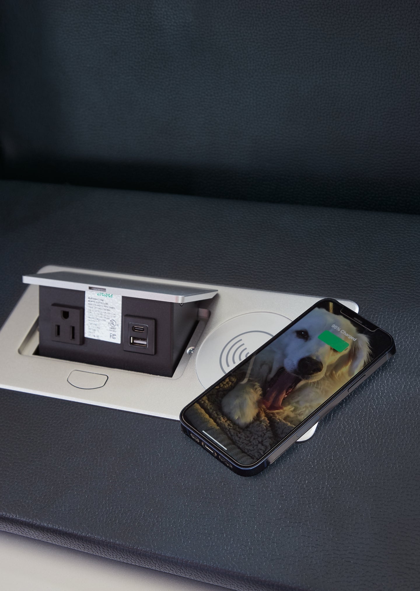 Details | One-touch power control with adjustable positions, Easy View™ adjustable headrest and zero-draw USB port, Zero-draw technology only consumes power when the USB receptacle is in use, Corner-blocked frame with metal reinforced seat, Attached cushions, High-quality foam cushions wrapped in poly fiber, Faux leather upholstery, Ambient blue LED lighting on base for a theater-style experience, Armrests with flip-top storage and cup holder, Drop-down table with LED reading lights, dual cup holders, electrical outlet, USB charging port and wireless charging, Power cord included; UL Listed | |