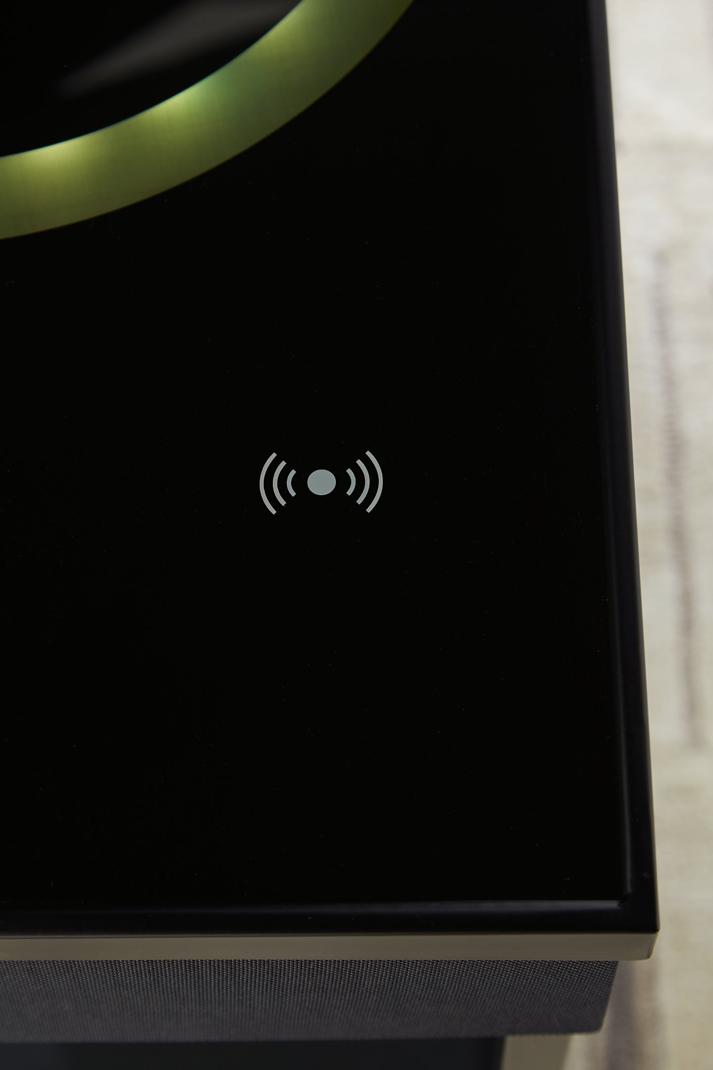 Details | Made with engineered wood, glass and metal, Metal frame with black finish, Polyester fabric in black, Fixed lower shelf, Glass tabletop with wireless charging and touch-button controls, Two 3" full-range speakers; two 1" tweeter speakers; 5.25” subwoofer, Wireless connectivity; aux audio input; MP3 port, USB-A and USB-C charging ports, LED light effect on top, Power cord included; UL Listed | |