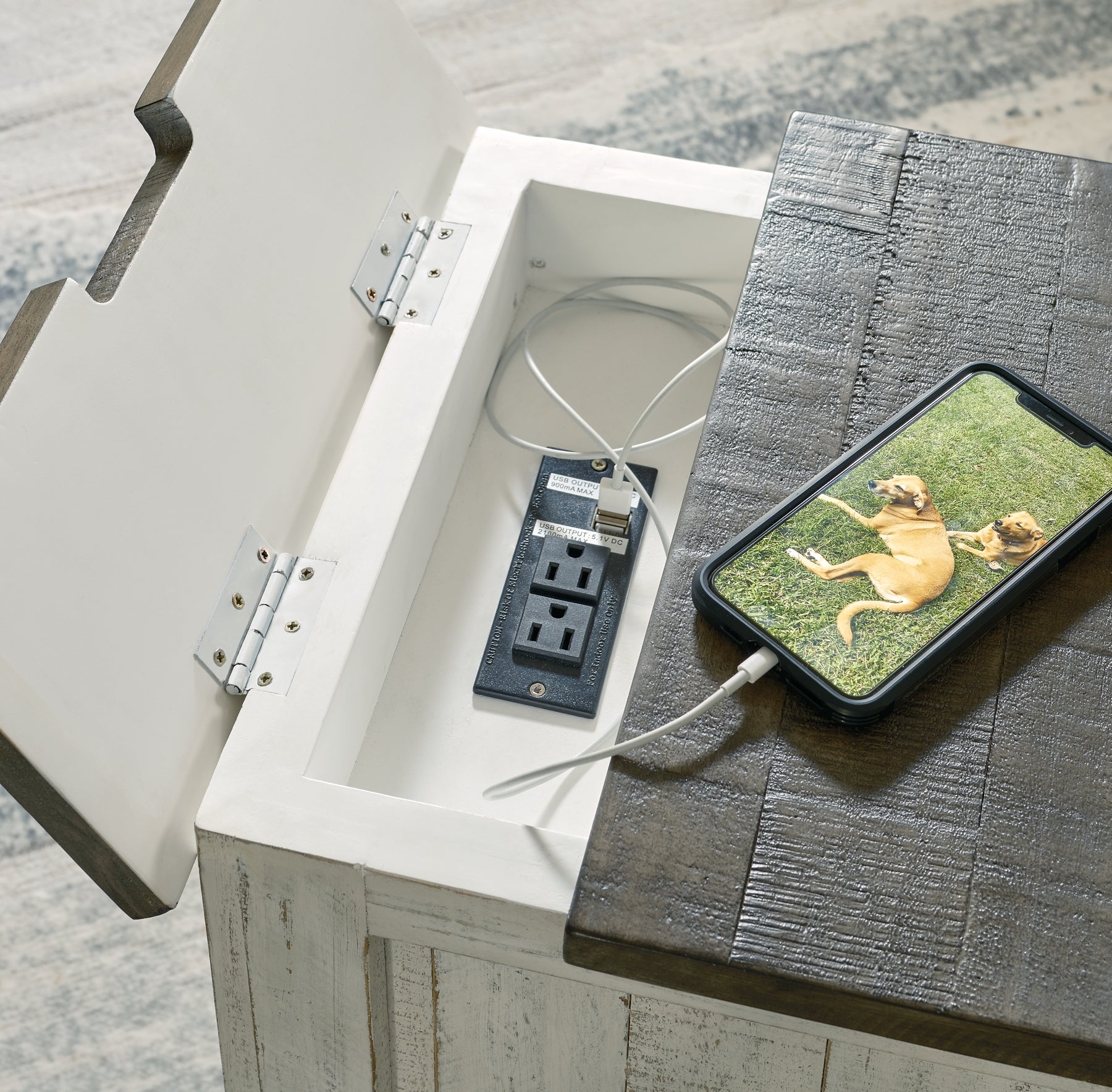 Details | Made of pine wood, pine veneer and engineered wood, Two-tone finish; distressed weathered gray top with distressed vintage white base, Antiqued iron-tone hardware, Cabinet door reveals single fixed shelf, 110V power supply with dual USB charging port, Power cord included; UL Listed, Minor assembly required, simply lay flat and attach feet | |