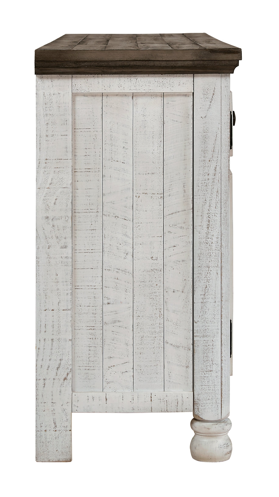 Details | Made of wood, veneer and engineered wood, Two-tone finish with distressed weathered gray top on vintage white case, 4 doors, 2 adjustable shelves in right and left cabinets, Single adjustable shelf behind center glass front doors, Open center cubby space, Cutouts for cord management, Assembly required | |