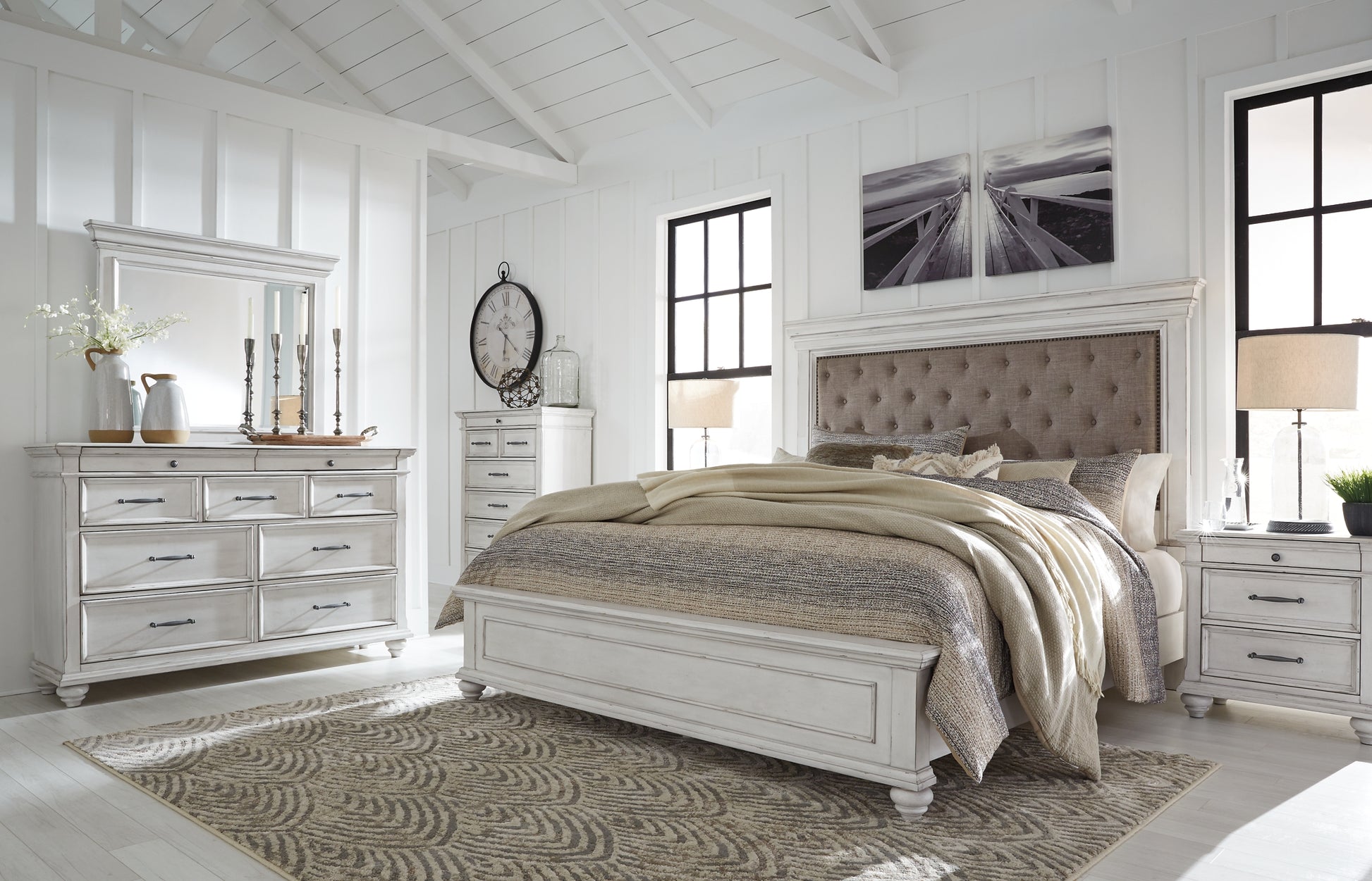 Details | Includes queen upholstered headboard, panel footboard and rails, Made with solid wood, veneers and engineered wood, Distressed whitewash finish, Button tufted fabric upholstery, Nailhead trim, Foundation/box spring required, sold separately, Mattress available, sold separately, Assembly required | |