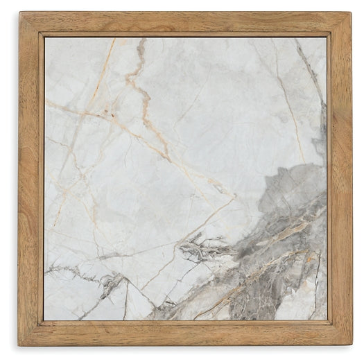 Details | Made with hardwood solids, mango veneer, sintered stone and metal, Light natural wood-tone finish, Frame with black finish, Sintered stone is a non-porous, man-made material that mimics the look of natural stone, Lower shelf, Assembly required | |
