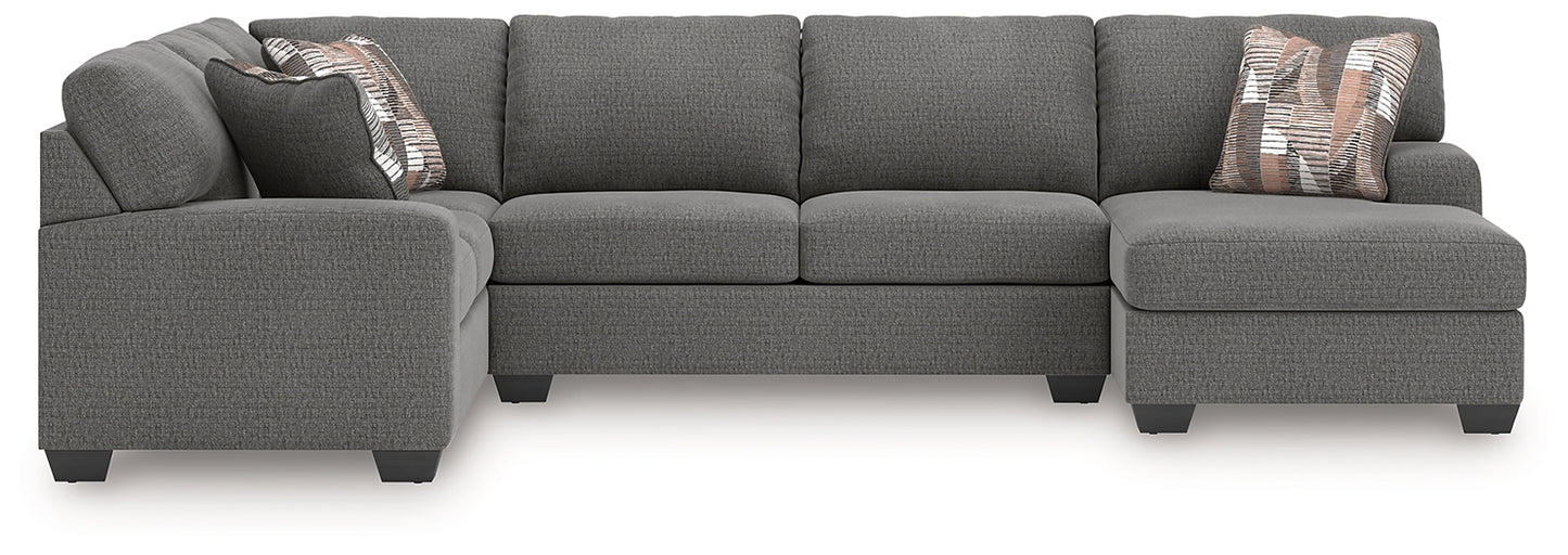 Details | Includes 3 pieces: left-arm facing sofa with corner wedge, armless loveseat and right-arm facing corner chaise, "Left-arm" and "right-arm" describe the position of the arm when you face the piece , Corner-blocked frame , Attached back and loose seat cushions, High-quality foam cushions wrapped in poly fiber, Accent pillows included, Pillows with soft polyfill, Polyester upholstery, Exposed feet with faux wood finish , Platform foundation system resists sagging 3x better than spring system after 20,000 testing cycles by providing more even support, Smooth platform foundation maintains tight, wrinkle-free look without dips or sags that can occur over time with sinuous spring foundations | |