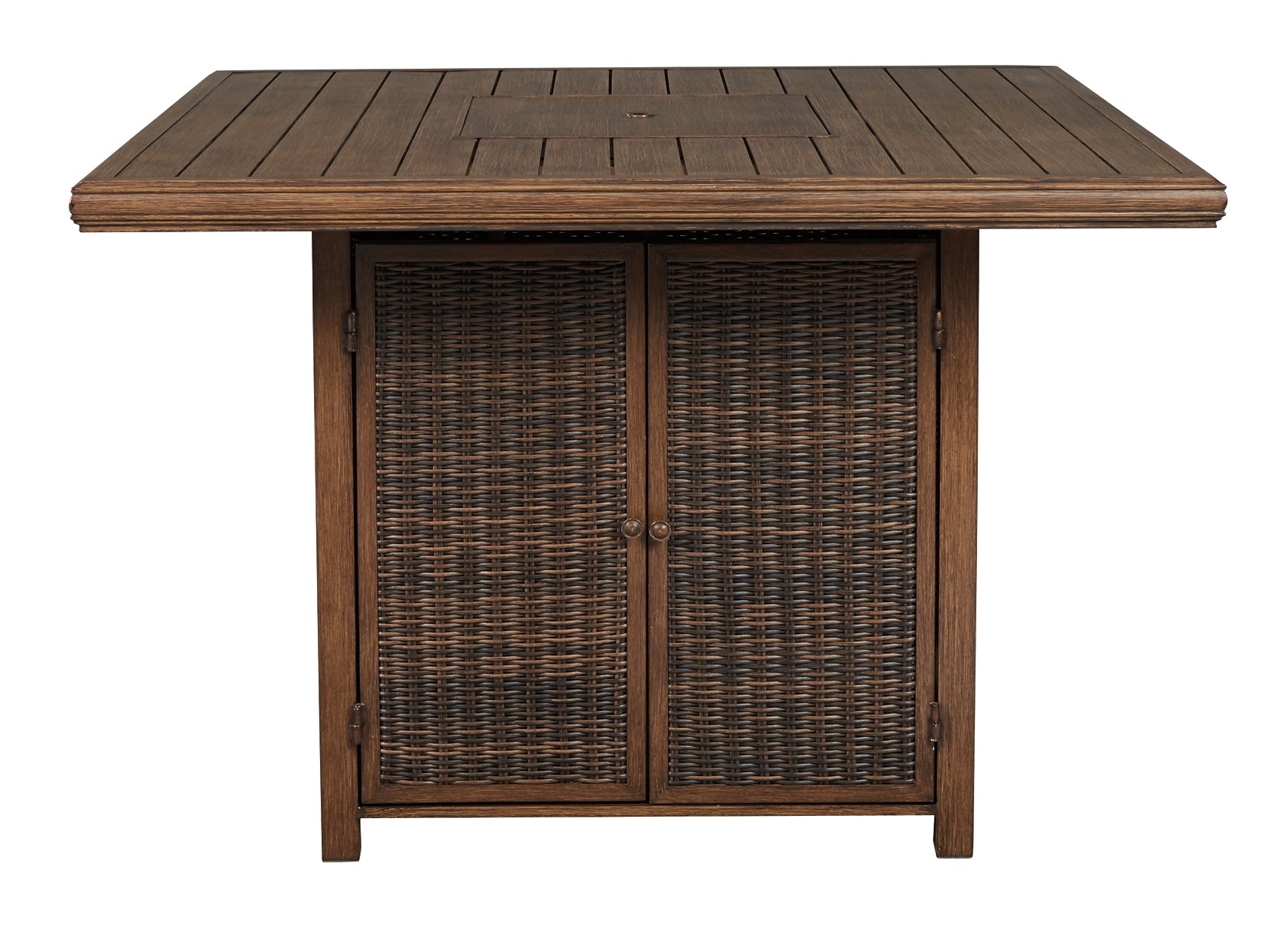 Details | Accommodates up to 8; bar stools sold separately, Door conceals gas propane tank (not included), Rust-proof aluminum frame with wood-look tabletop, Side panels accented with all-weather, handwoven resin wicker, 56" square fire pit table with CSA-approved 55,000 BTU stainless steel burner, glass beads, burner cover and enclosed storage area with shelves, Battery-operated ignition system with adjustable flame control; battery included, Convertible to natural gas, Gas line or propane tank connector hose not provided, Assembly required, Comes with protective weather cover | |