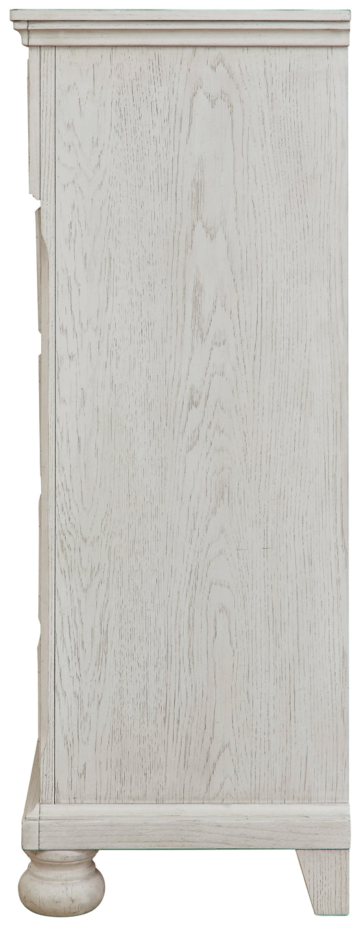 Details | Made with wood, select oak veneer and engineered wood, Antiqued white finish with grain texture, 5 smooth-gliding drawers with dovetail construction and metal ball-bearing side glides (upper drawers with felt bottoms), Dark bronze-tone knobs | |