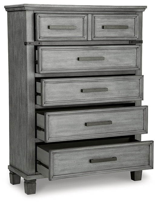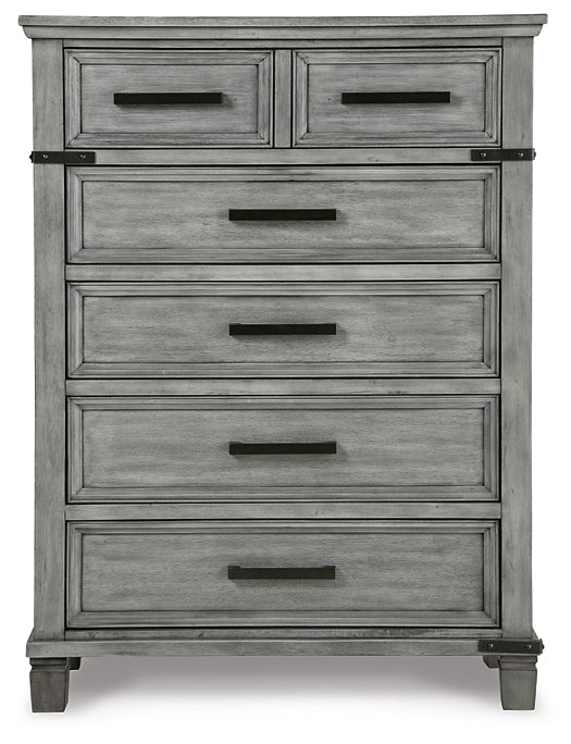 Details | Made with acacia wood, acacia veneer and engineered wood, Light weathered gray finish, Metal accents and straps with aged bronze-tone finish, 5 smooth-gliding drawers with dovetail construction | |