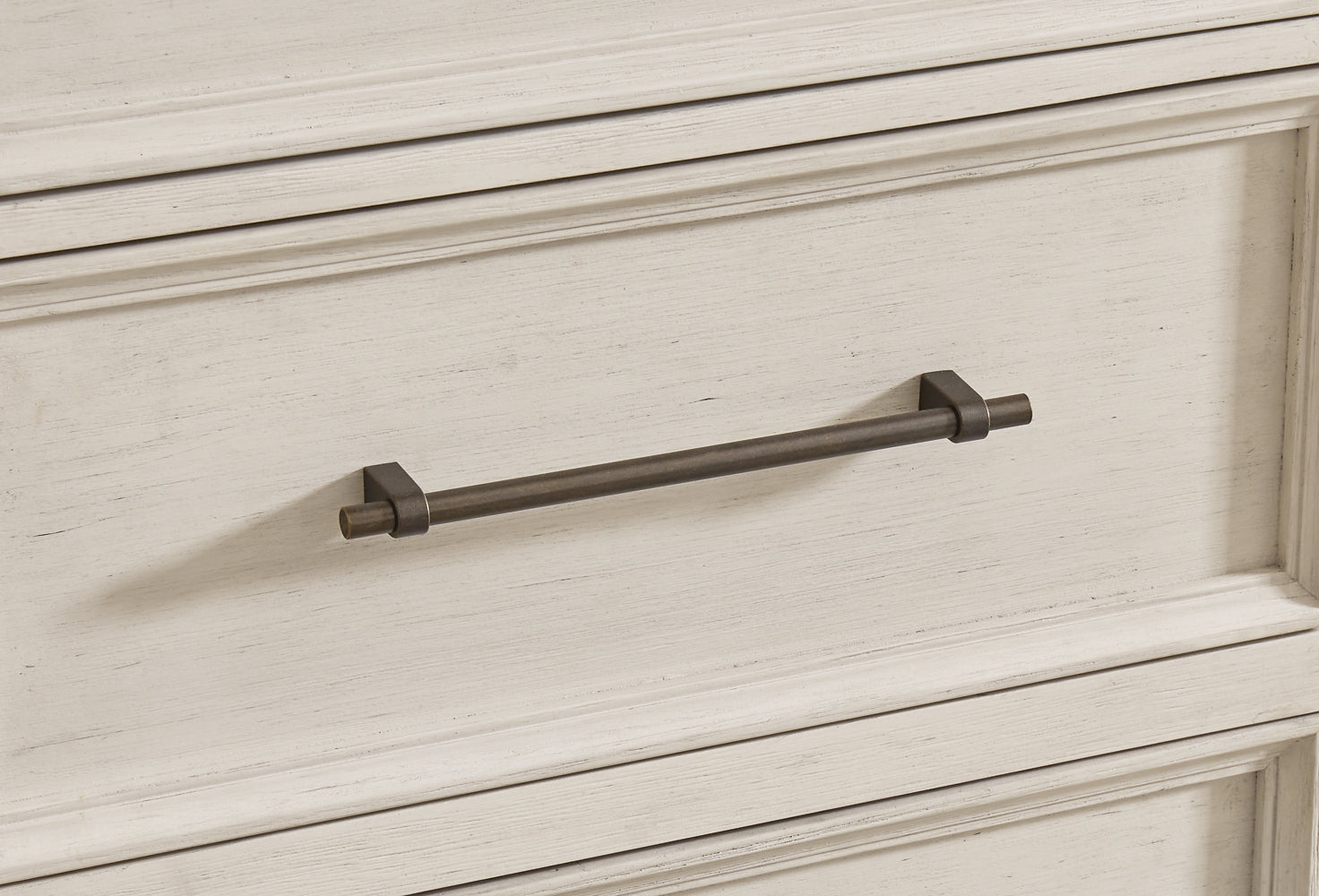 Details | Includes dresser and mirror, Made with hardwood solids, veneers and MDF substrates, Two-tone finish (antiqued white and light gray wood tone), Dark bronze-tone bar pulls, 2 glass-front cabinets, each with single storage shelf, 5 drawers with fully finished interior, dovetail construction and heavy duty ball-bearing side glides (top drawer felt lined), Mirror attaches to back of dresser | |
