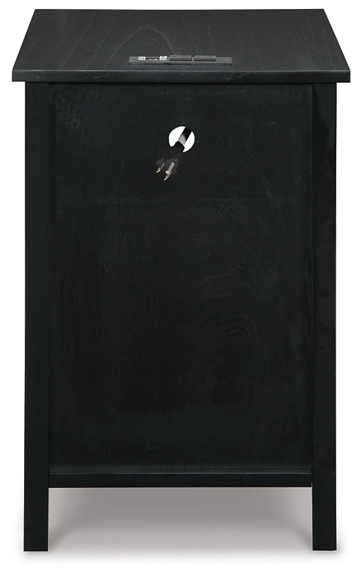 Details | Made with solid wood, wood veneer and MDF substrate, Black wood tone finish, Table features storage cabinet, open cubby shelf and pull-out tray, 110V power supply with dual USB charging ports, Power cord included; UL Listed, Due to the use of natural materials, some variations may occur, Assembly required | |