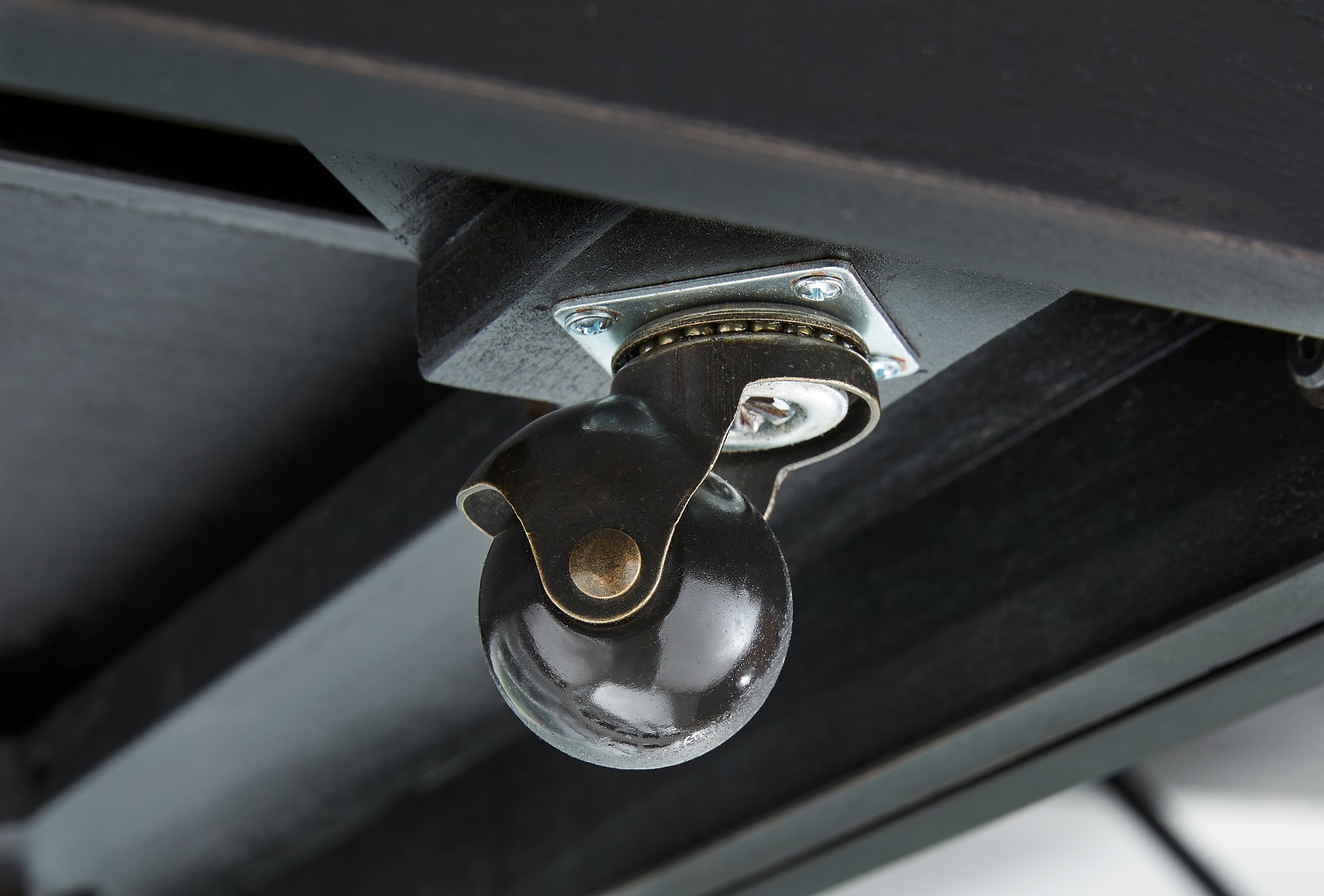 Details | Made with hardwood solids, mindi veneer and MDF substrate, Black finish with wood grain texture, Fluted glass tabletop, Smooth-gliding drawer, Drawer pulls with goldtone finish, Lower open shelf, Casters for easy mobility | |