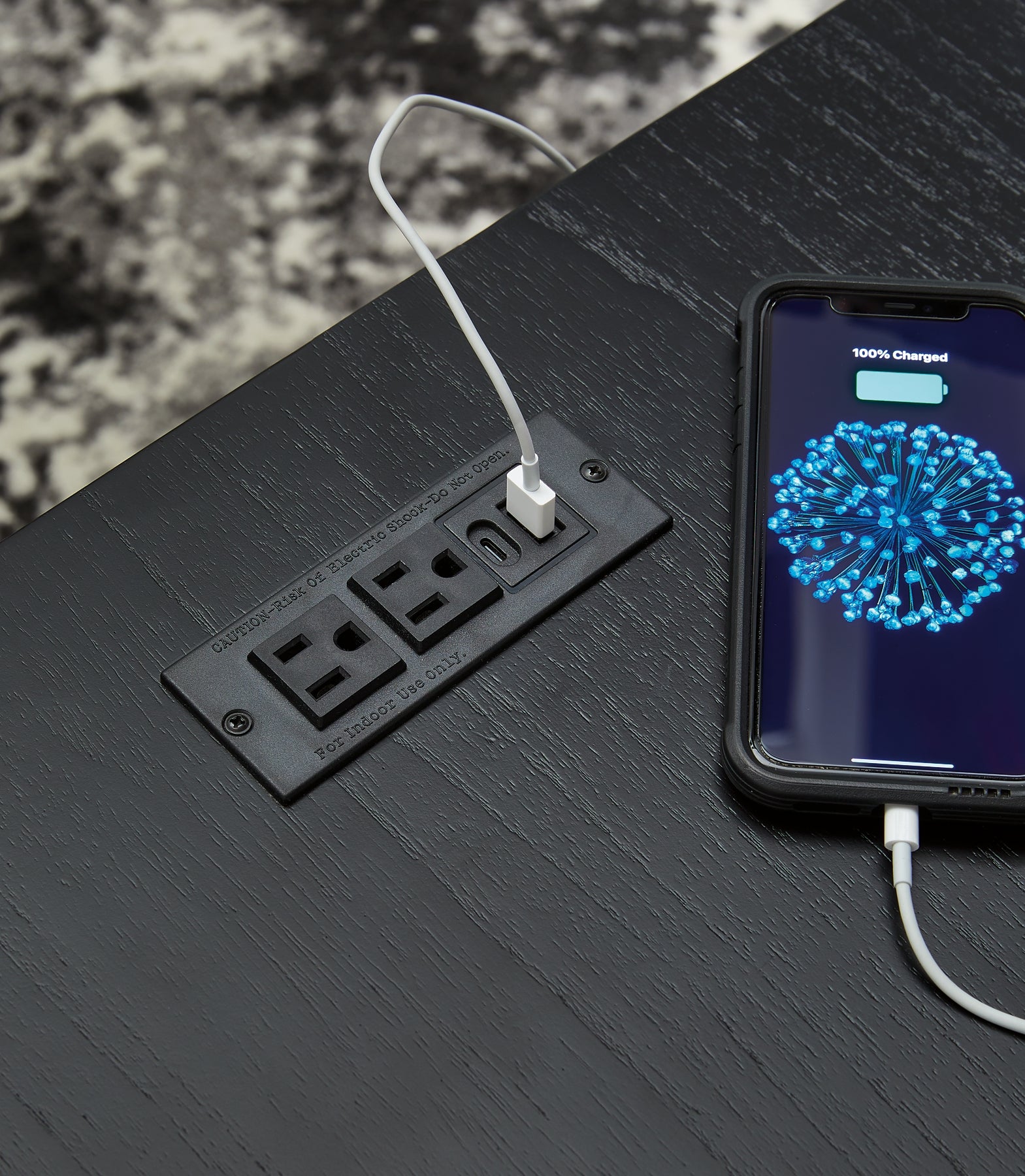 Details | Made with hardwood solids, mindi veneer and MDF substrate, Black finish with wood grain texture, 2 smooth-gliding drawers, Drawer pulls with goldtone finish, Open cubby, 110V power supply with USB-A and USB-C charging ports, Power cord included; UL Listed | |