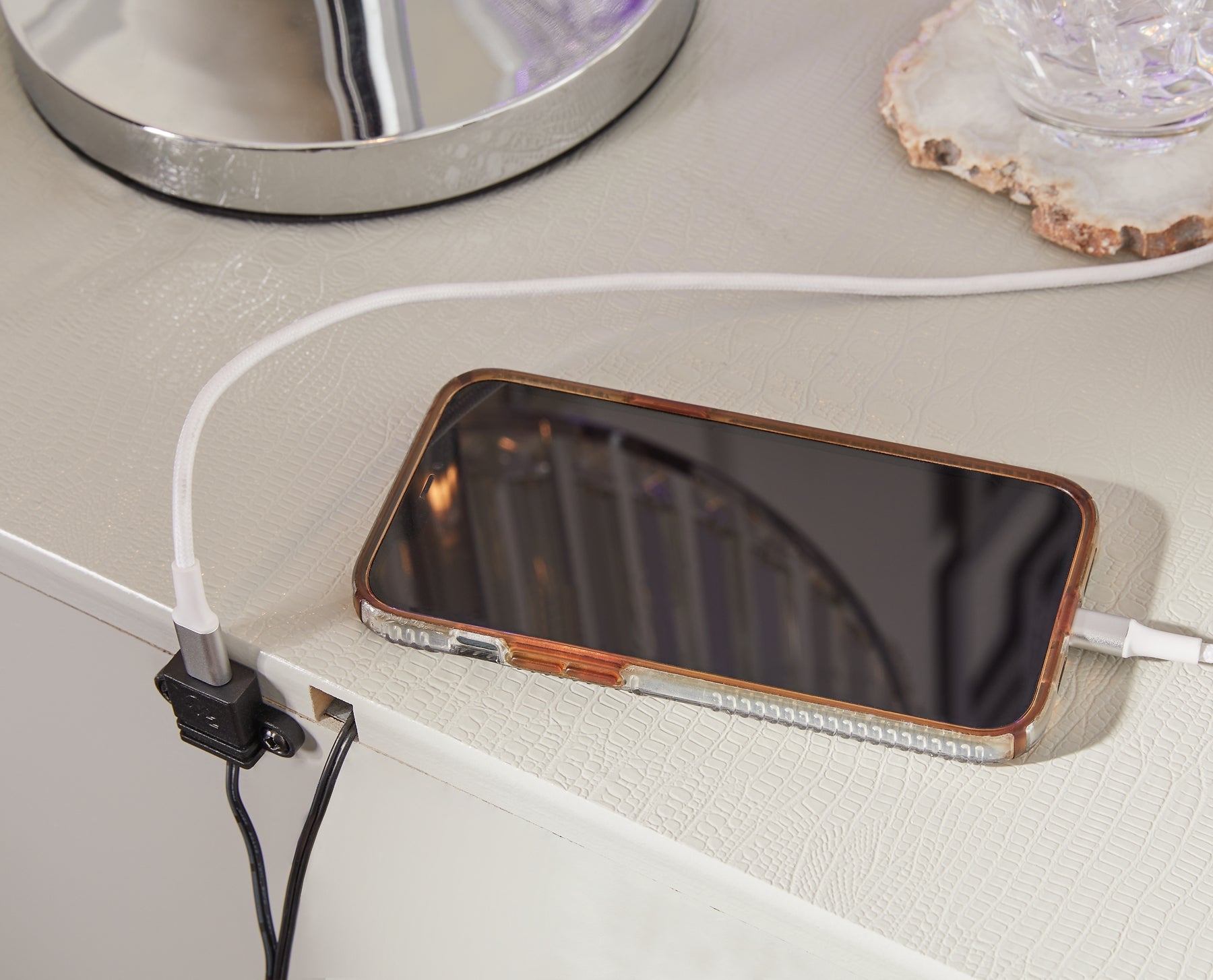 Details | Made with engineered wood (MDF/particleboard/plywood) and decorative laminate for the right balance of affordability and durability, Silvertone pearl finished faux gator, Decorative laminate replicates natural or man-made material surfaces with consistent color, pattern and texture, Handles with faux crystal accents, 2 smooth-gliding drawers, Drawer interiors are lined with a faux linen laminate for a clean, finished look, Faceted chrome-tone details, USB and wireless charging options, Power cord included; UL Listed, Minor assembly required | |